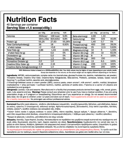 Μαλτοδεξτρίνη 51%, συμπύκνωμα πρωτεΐνης ορού γάλακτος, ινουλίνη 7%, σκόνη κακάο με μειωμένα λιπαρά, φυσικό κηρώδες καλαμπόκι 5%, μικρονισμένη μονοϋδρική κρεατίνη 5%, καζεϊνικό ασβέστιο (περιέχει γάλα), πυκνωτικό (κόμμι κυτταρίνης), αρώματα, γαλακτωματοποιητής: λεκιθίνες (σόγιας), απομονωμένη πρωτεΐνη ορού γάλακτος, αλάτι, γλυκαντικό (σουκραλόζη).