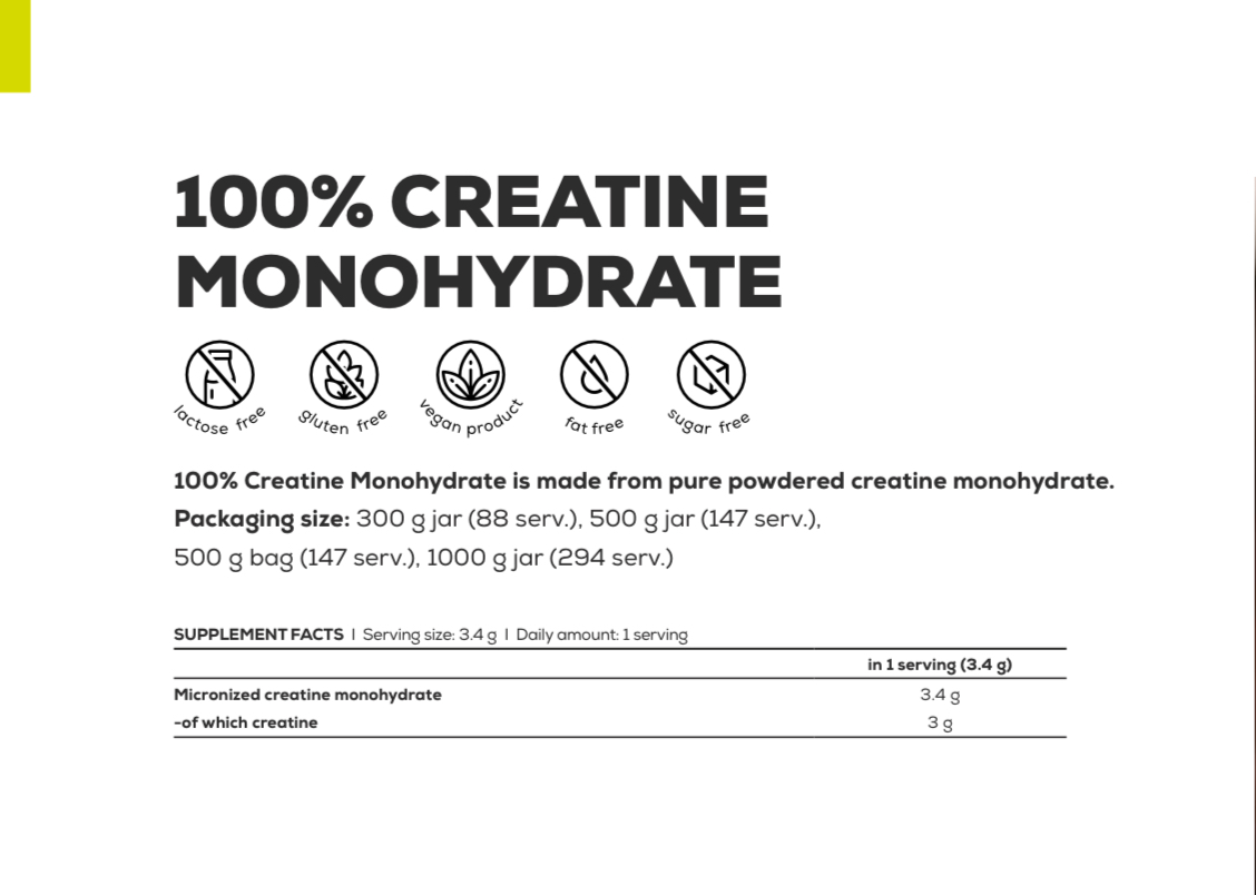 Το 100% Creatine Monohydrate είναι παρασκευασμένο με καθαρή, φαρμακευτικής ποιότητας μονοϋδρική κρεατίνη σε μορφή σκόνης. Είναι άγευστο κι έτσι είναι εύκολο ν’αναμιχθεί με άλλα συμπληρώματα διατροφής όπως προϊόντα αύξησης βάρους και ροφήματα πρωτεΐνης.