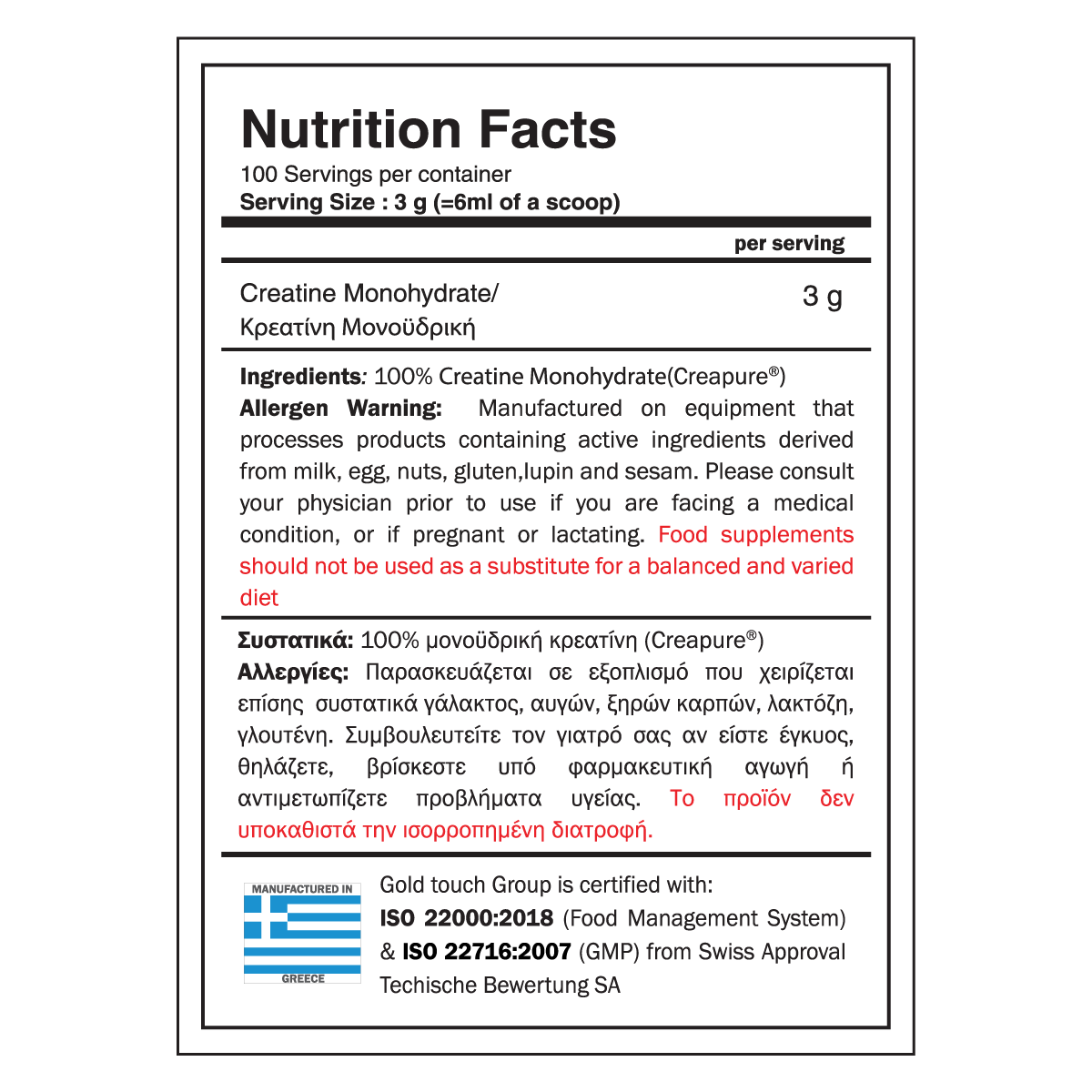 Το Crea Touch μας περιέχει 100% Creapure® – Μονοϋδρική Κρεατίνη, που παρασκευάζεται στη Γερμανία σύμφωνα με αυστηρά πρότυπα παραγωγής GMP και ISO. Το Creapure® αναγνωρίζεται παγκοσμίως για την εξαιρετική καθαρότητα, ασφάλεια και απόδοσή του — θεωρείται το χρυσό πρότυπο για τα συμπληρώματα κρεατίνης!